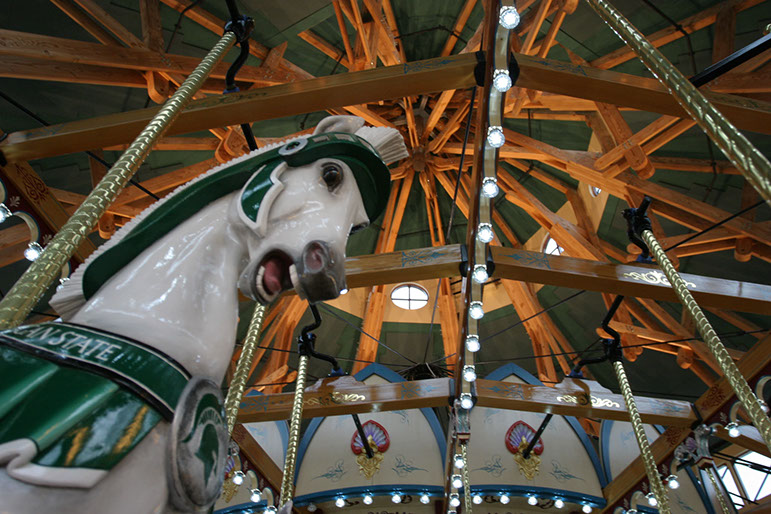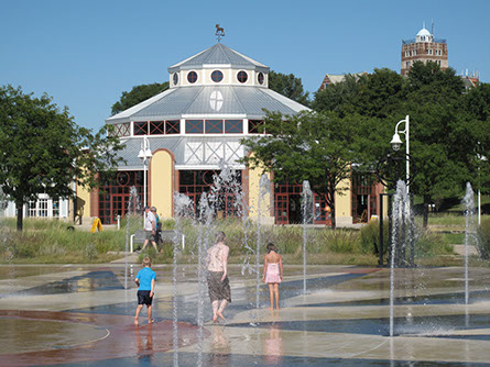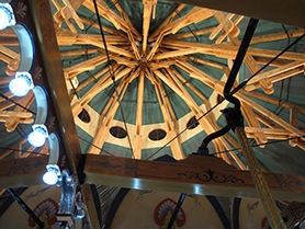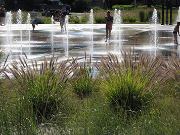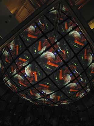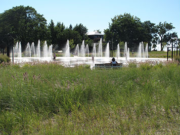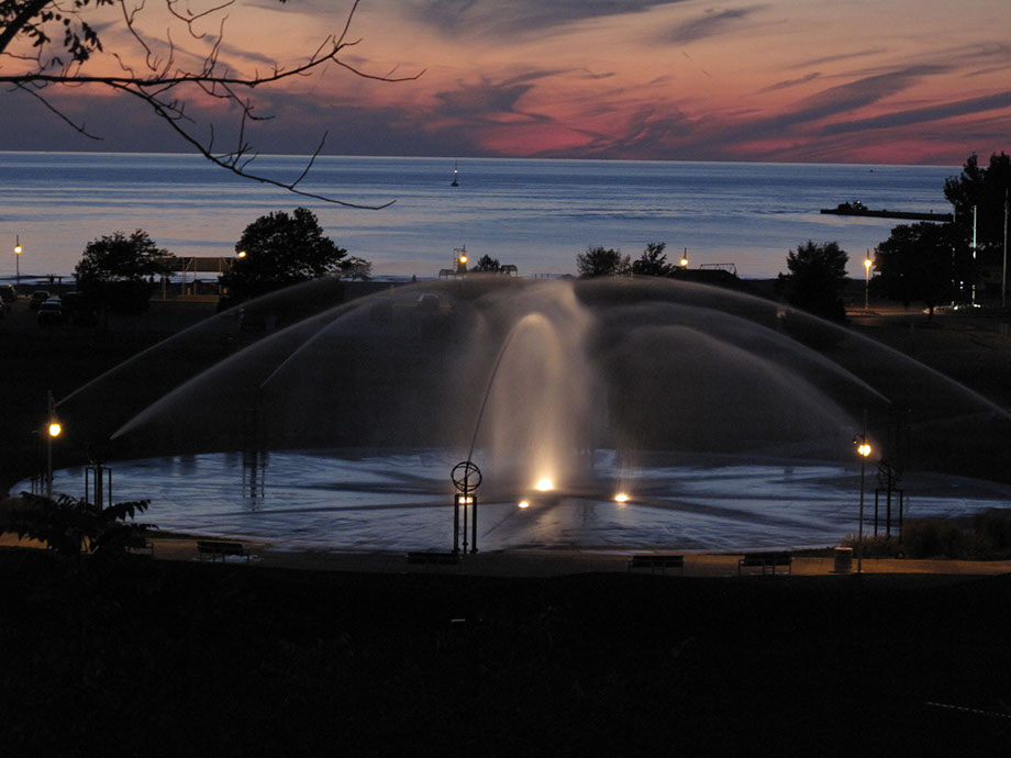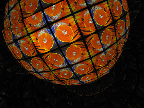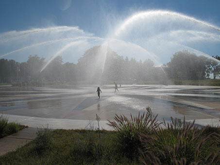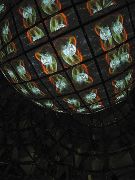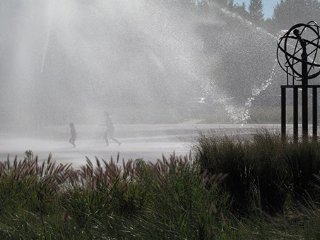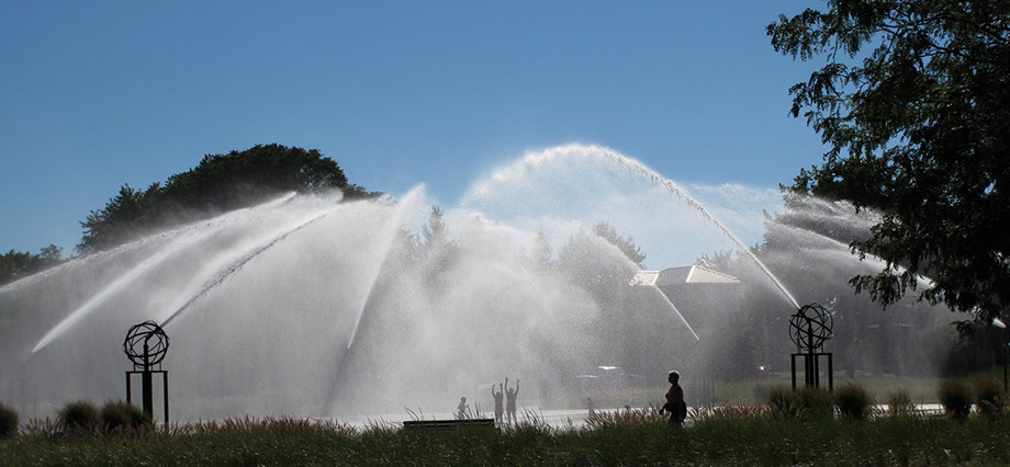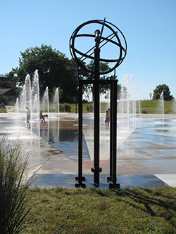 The fountain alternates between two states... soft, upward play jets and The Deluge. Armillaries, expressive of the celestial sphere, contain the high pressure spray nozzles.
