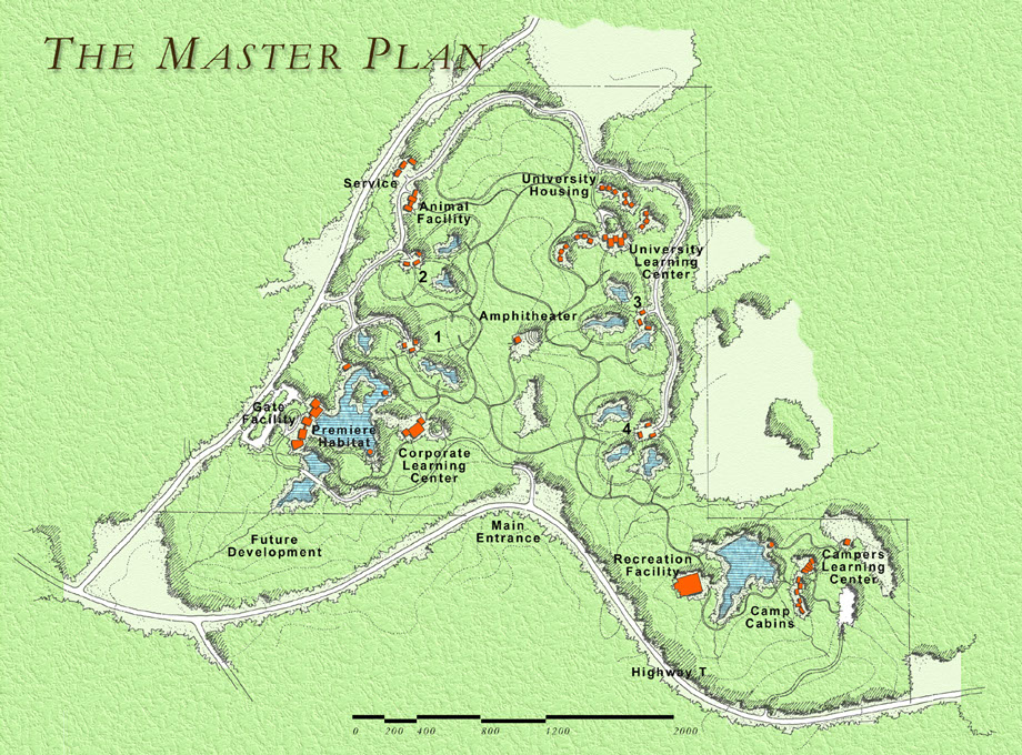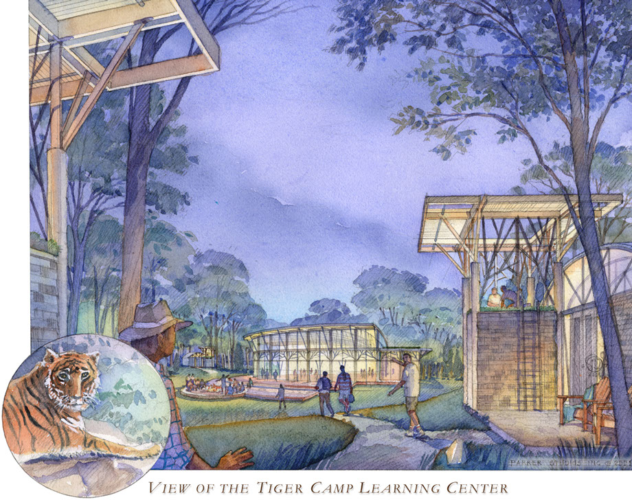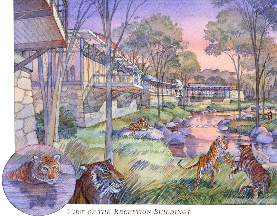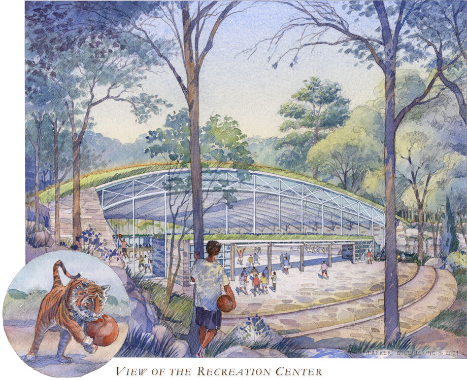 Planning for an Environmental Science Learning Center for De Paul University joined a University Learning Center, Student Housing, a Summer Camp, a Corporate Learning Center and day visitor's facilities including exhibition spaces, along with retail and restaurants... all surrounding a series of five tiger habitats. The project was to be located near Ste. Genevieve, Missouri. The Tiger Sanctuary was to suppliment the University's Environmental Science facilites in Chicago. Illuminating the idea that tigers are in fact canaries in a coal mine and that the severe challenges they face in the wild take measure of the broader threats to life on Earth, the Campus was to open new and important dialogs with the University Community and other constituencies while embarking on new kinds of intensive, adventurous, environmental education programs.